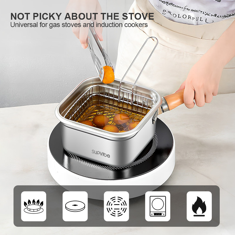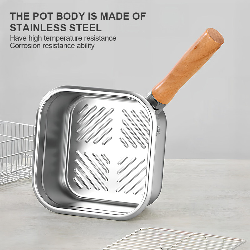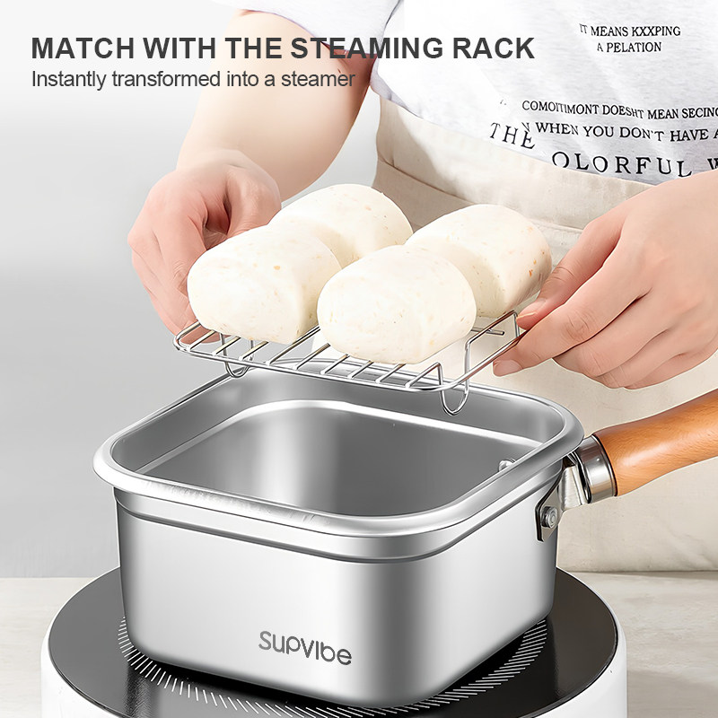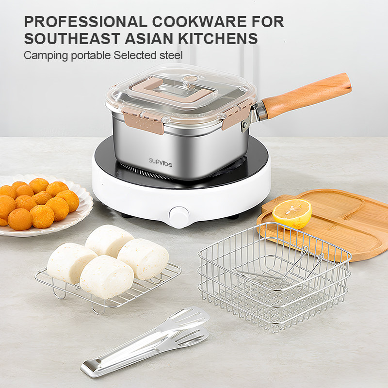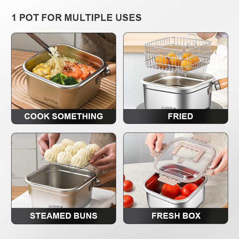 3. Multi-functional in one pot: ① When paired with a steaming rack, it can be transformed into a steamer. ② With a filter screen, it turns into a deep fryer; ③ Remove the handle, replace the lid and it becomes a food storage container. ④ Single pot use, switch to a cooking pot